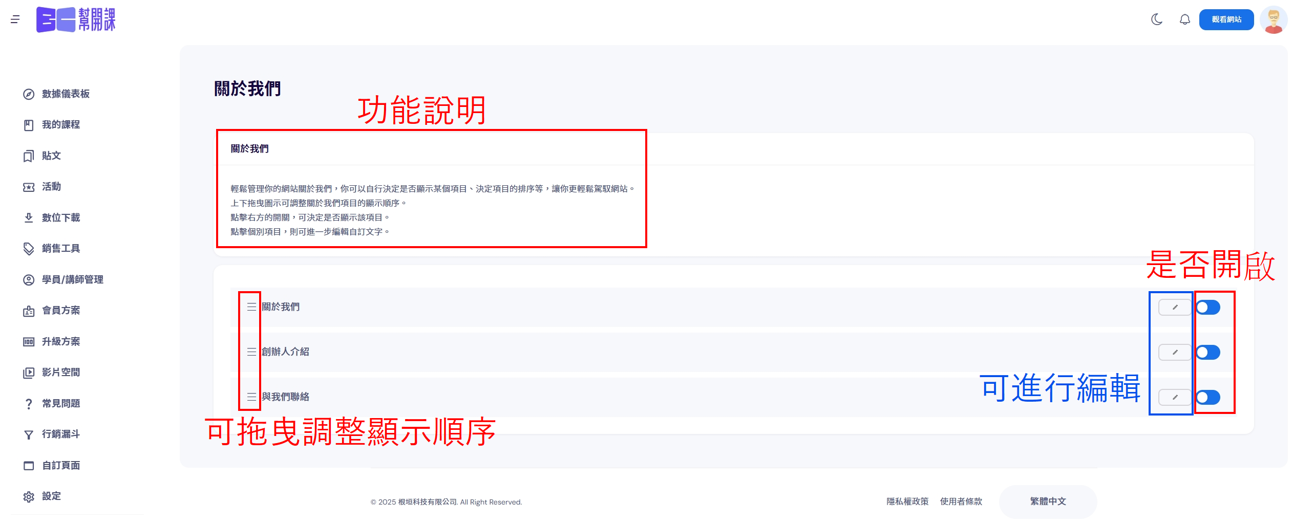 2、左側可以拖曳調整顯示順序,右側可以開啟/關閉以及編輯。