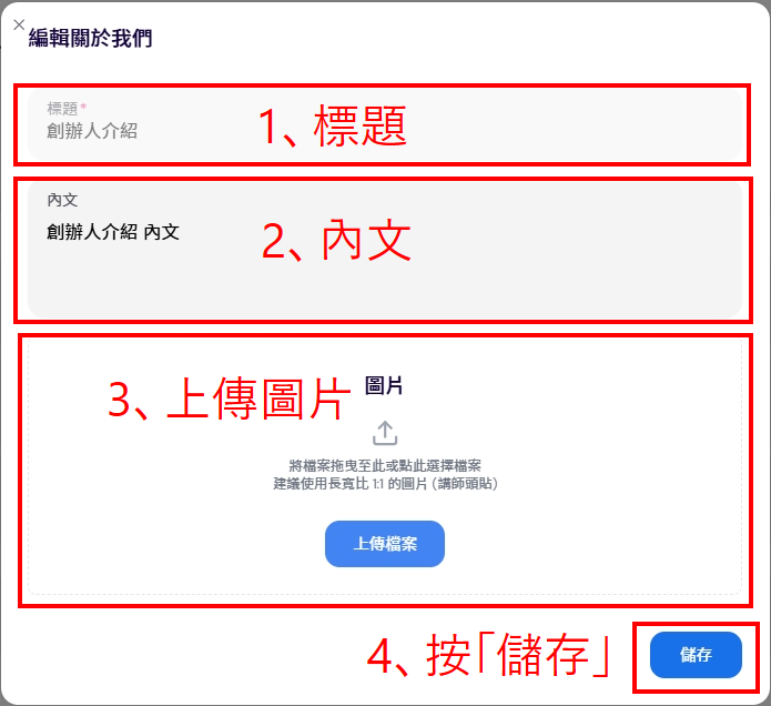 3、編輯內容,請填寫「標題」、「內文」,並「上傳圖片」,最後一定要按「儲存」。