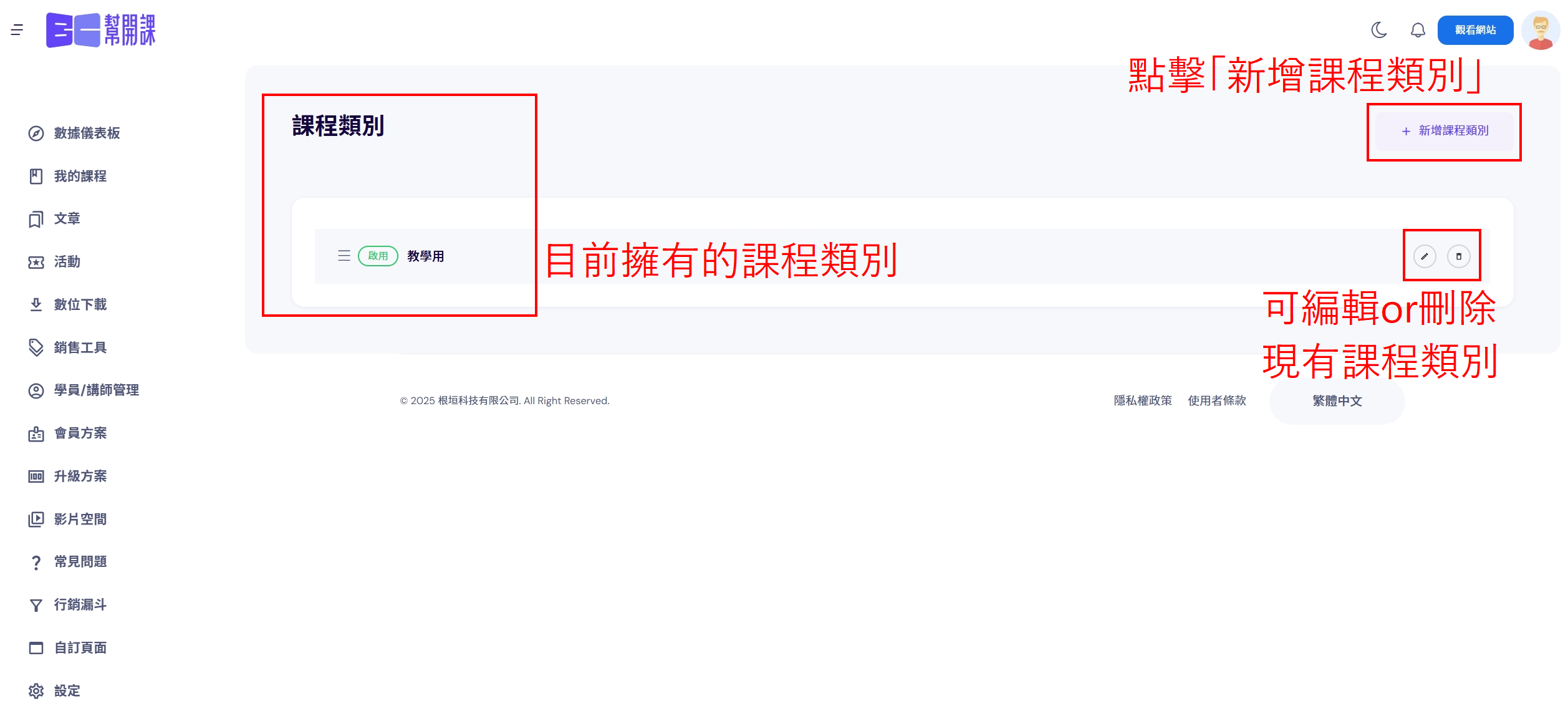 2、進到「課程類別管理」後,可以看到目前擁有的課程類別,右上角可以「新增課程類別」。