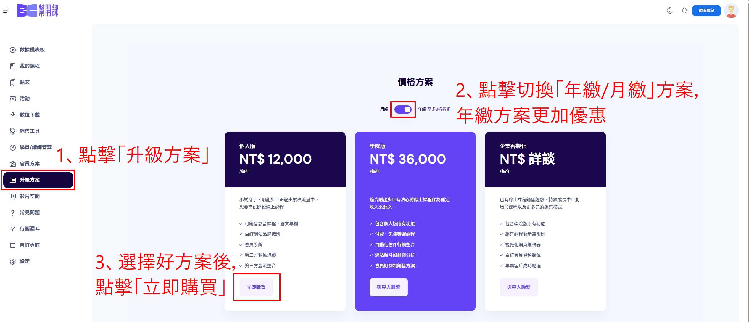 1、點擊左側功能列表「升級方案」,中間「月繳/年繳」按鈕可以切換,年繳可以獲得更優惠的方案;選擇好方案後,點擊「立即購買」,就會跳轉到結帳頁面。