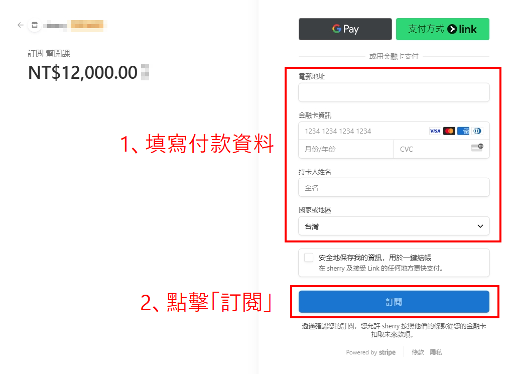 5、跳轉到付款頁面後,選擇您要使用的付款方式,並填寫正確資料,確認沒問題後,點擊最下方「訂閱」,這樣就大功告成了!