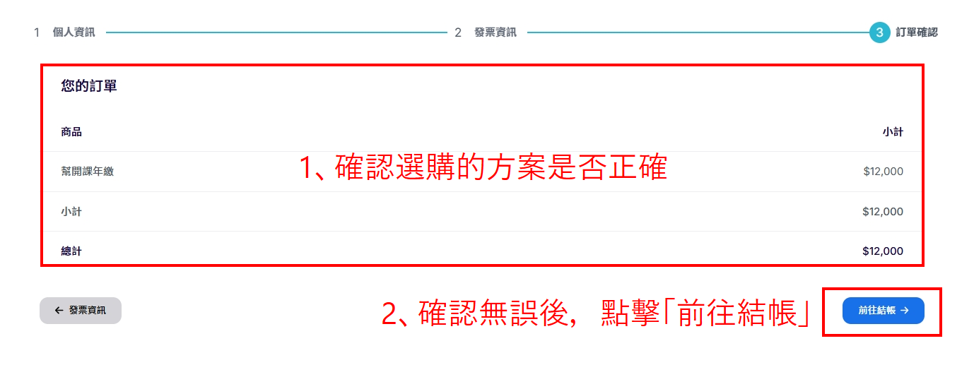 4、結帳頁面最後一步,確認您選購的方案是否正確,確認沒問題後,點擊右下角「前往結帳」。