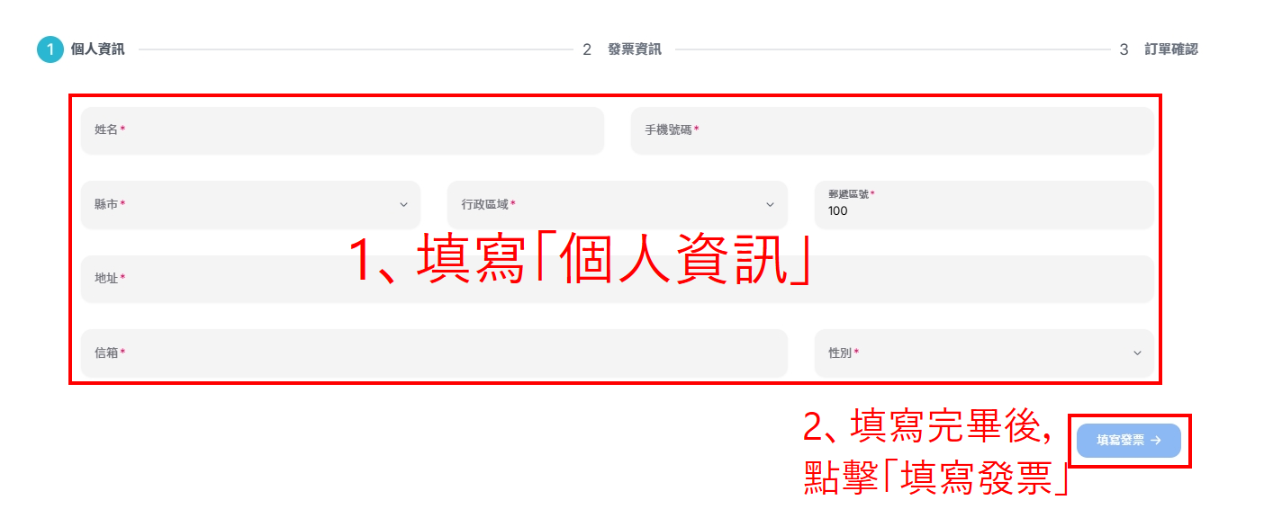 2、來到結帳頁面後,第一步要填寫「個人資訊」,全部填寫完畢後,點擊右下角「填寫發票」。