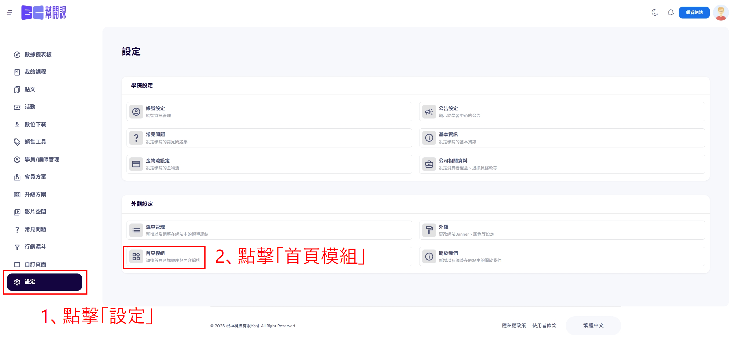 1、點擊左側功能列表「設定」,再點擊「首頁模組」。