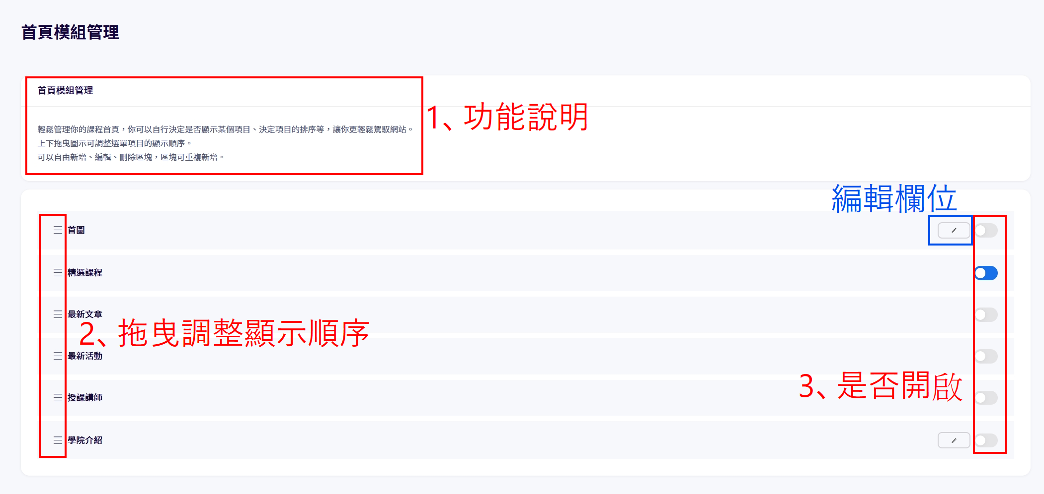 2、上方有說明首頁模組功能,左側可拖曳更改顯示順序,右側可決定是否開啟,以及編輯欄位。