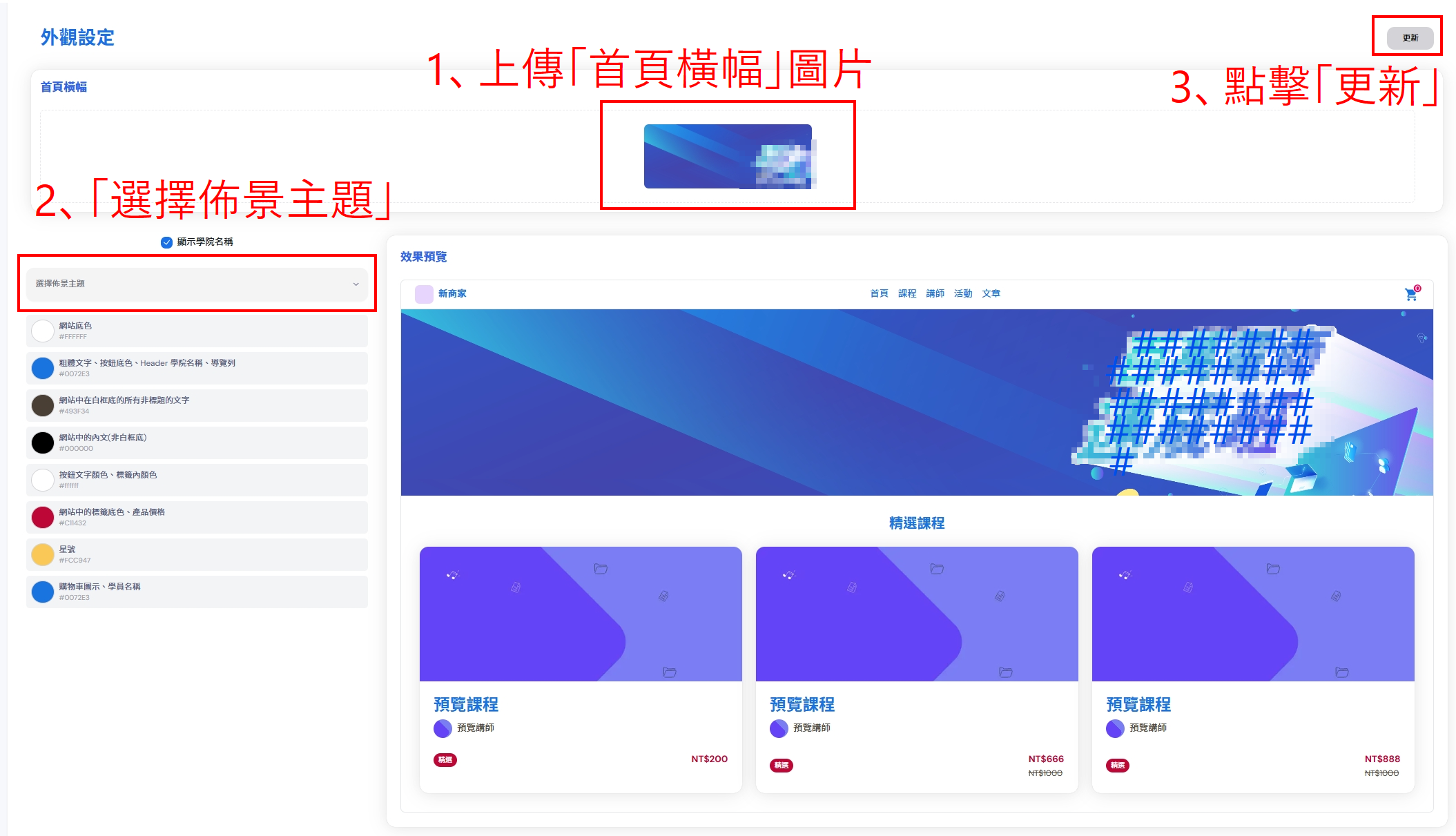 2、上傳「首頁橫幅」,再選擇「佈景主題」,確認沒問題後點擊「更新」。