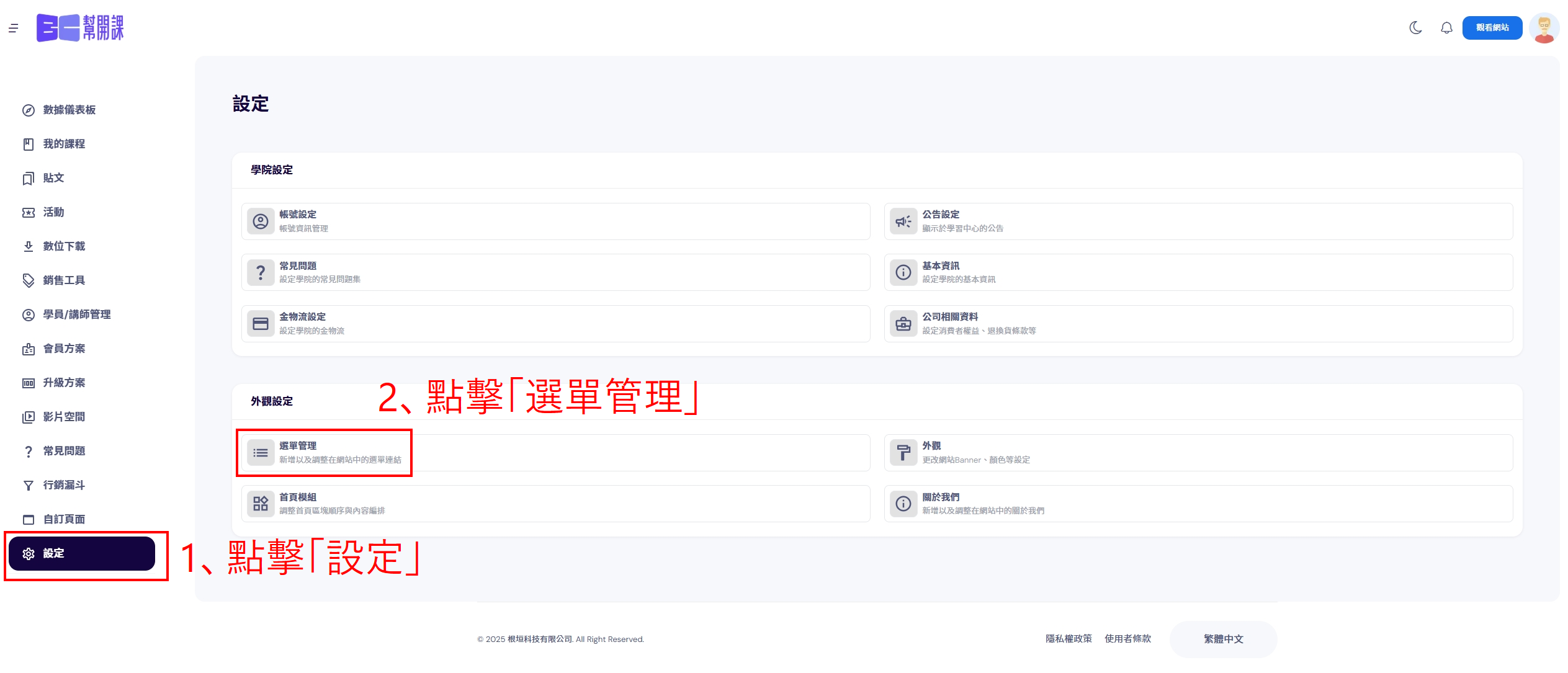 1、點擊左側功能列表「設定」,再點擊「選單管理」。