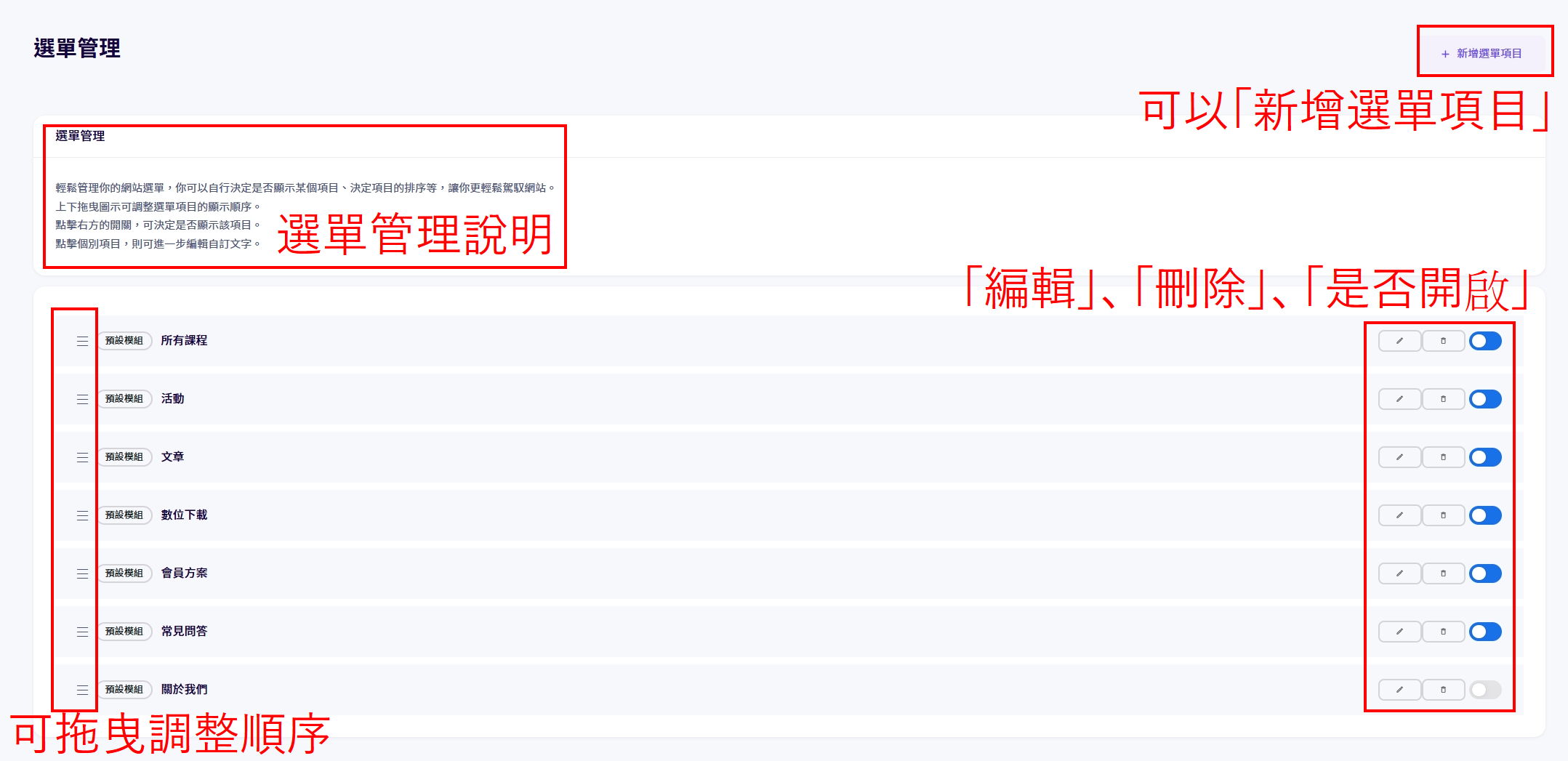 2、選單管理上方有說明,透過左側可進行「拖曳」調整順序;右側可以「編輯」、「刪除」、「是否開啟」,右上角亦可以「新增選單項目」。