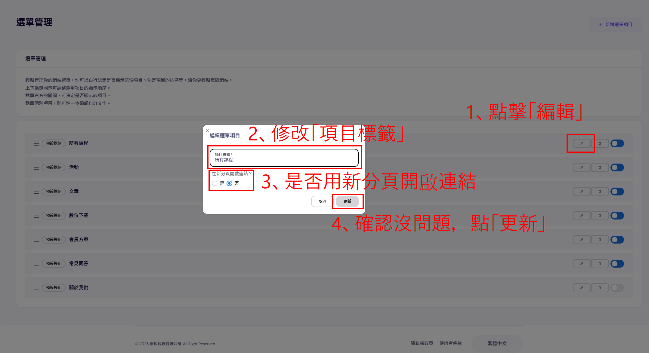 3、點擊要編輯的選單類別後方「鉛筆圖案」按鈕,修改「項目標籤」文字,選擇是否以新分頁開啟該選單類別,確認沒問題後點「更新」。
