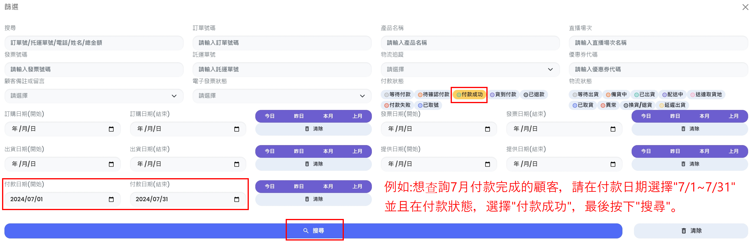 注意:若沒有選擇”付款成功”,會篩選出”開始付款,但付款失敗”的顧客