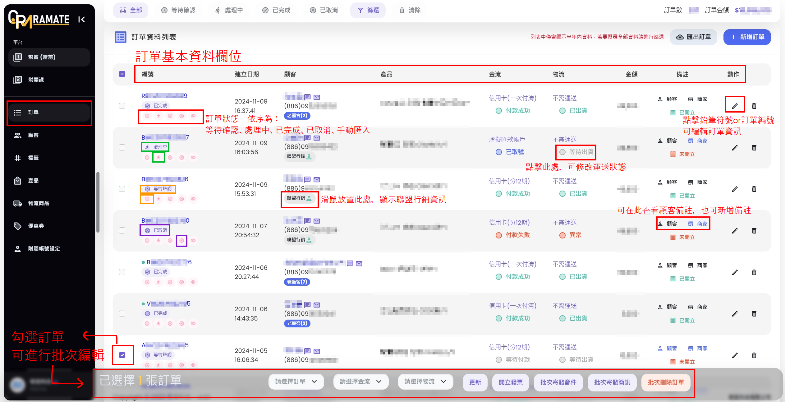 批量編輯:勾選訂單後,可進行批量編輯。(請注意!此功能會一次性編輯多筆訂單,請2次確認無誤後再進行編輯。)