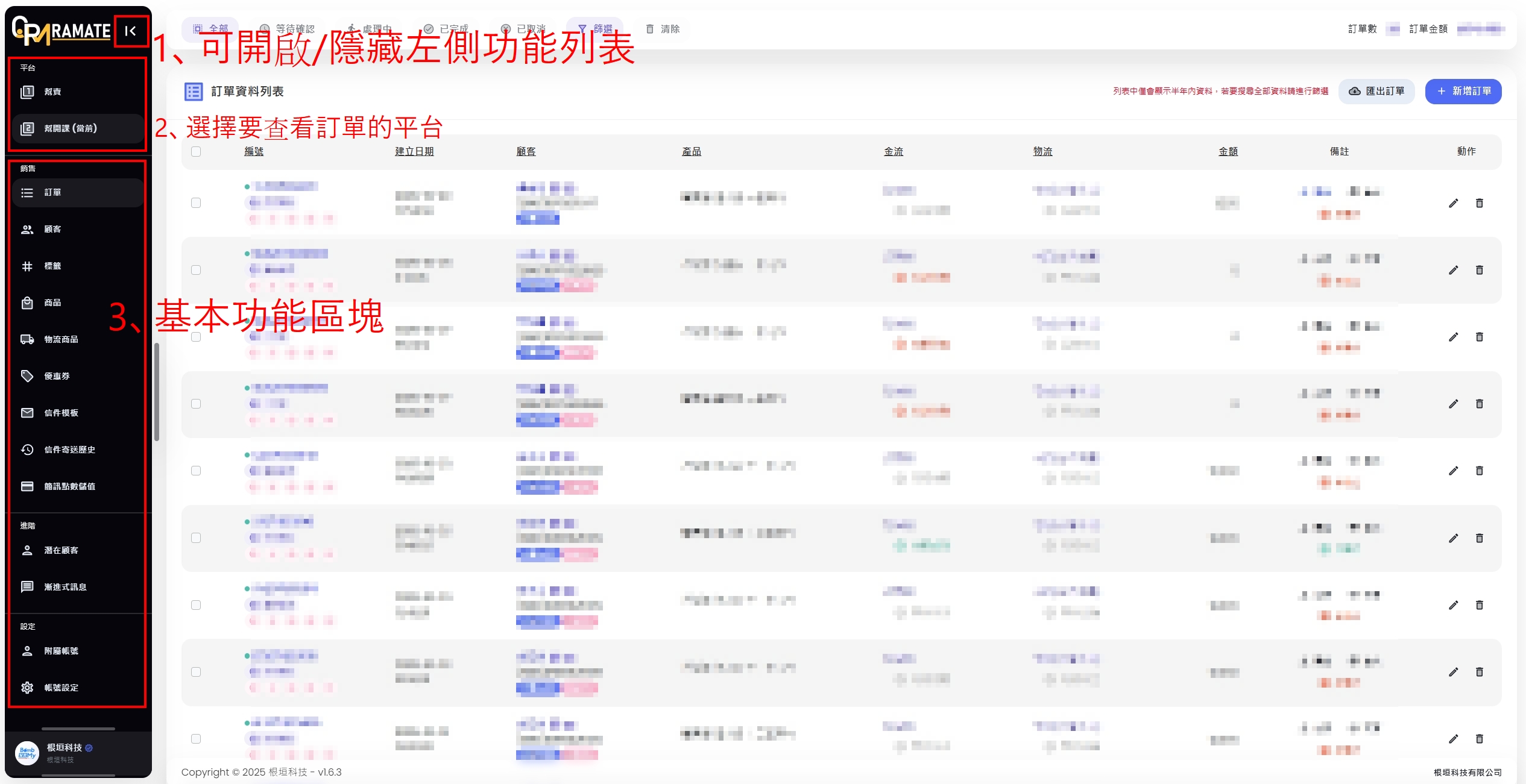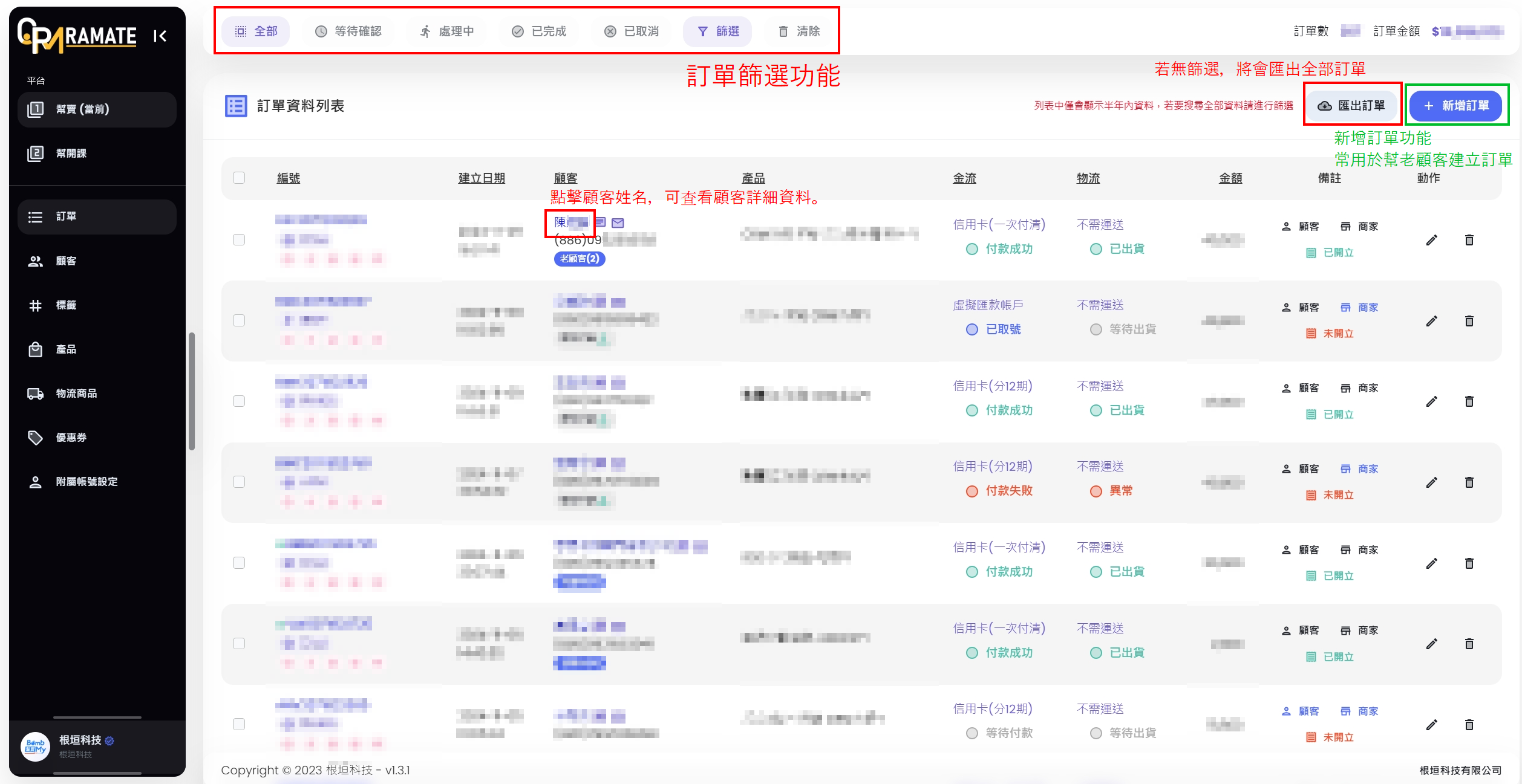 新增訂單:可以在CRM後台手動新增訂單。(常用於幫老顧客建立訂單)