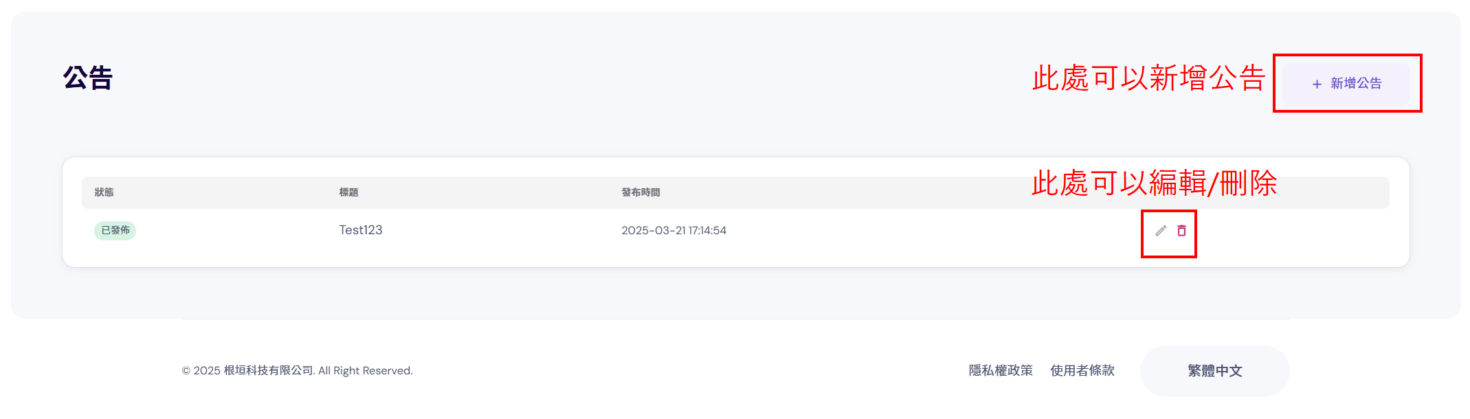 2、進入到公告頁面,可以新增、編輯、刪除公告。