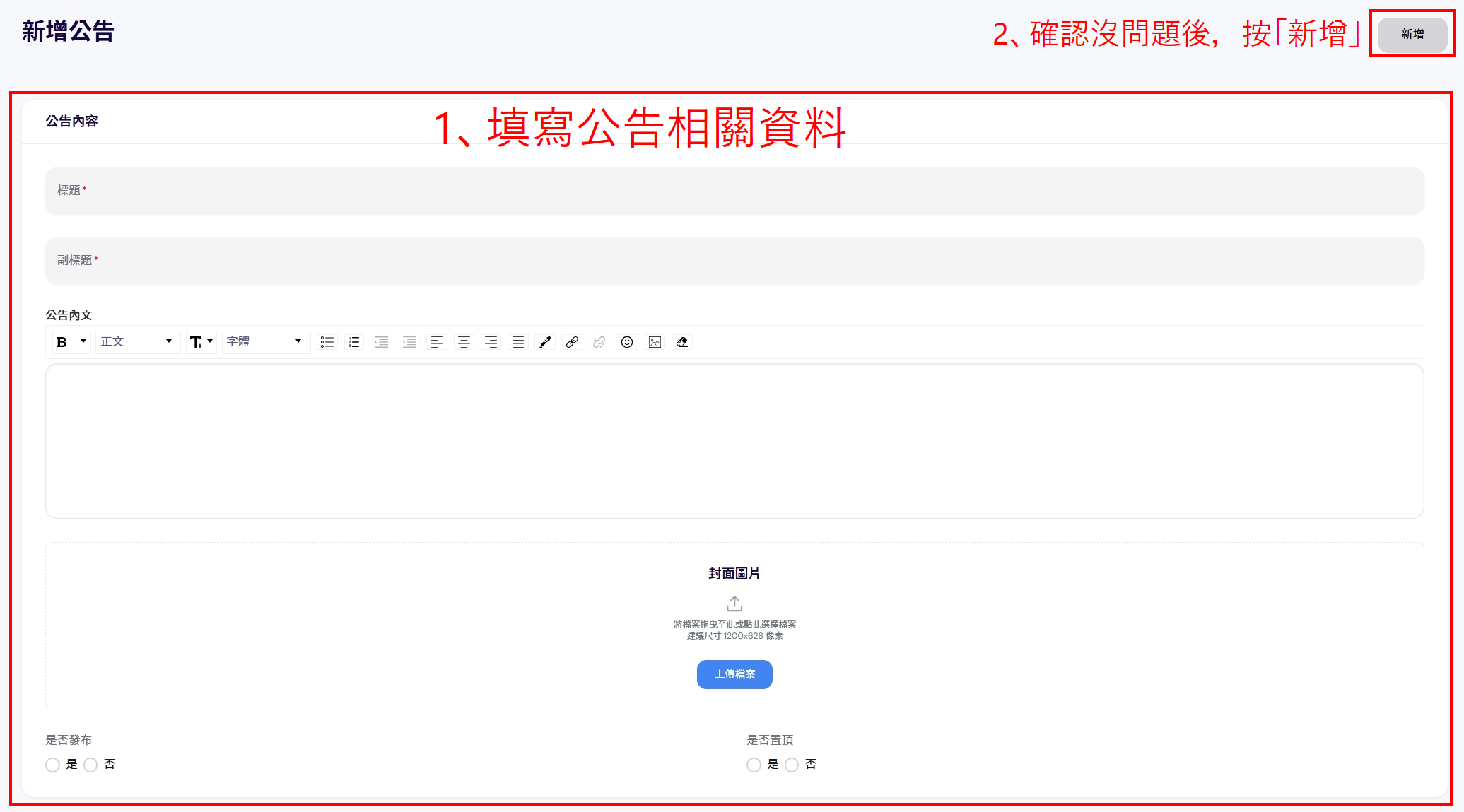 3、填寫公告資料,標題、副標題、內文、圖片、是否發布、是否置頂。