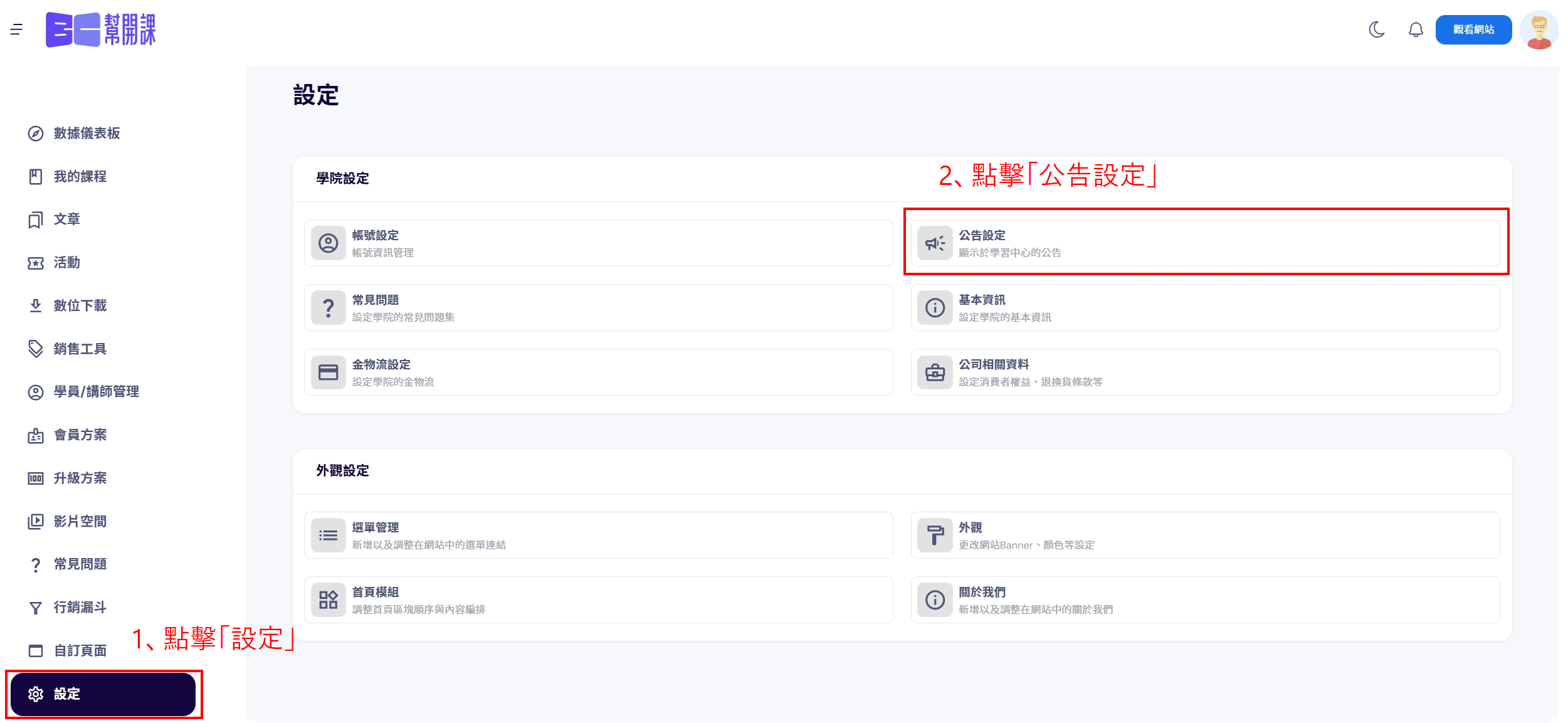 1、點擊左側功能列表「設定」,再點擊「公告設定」。