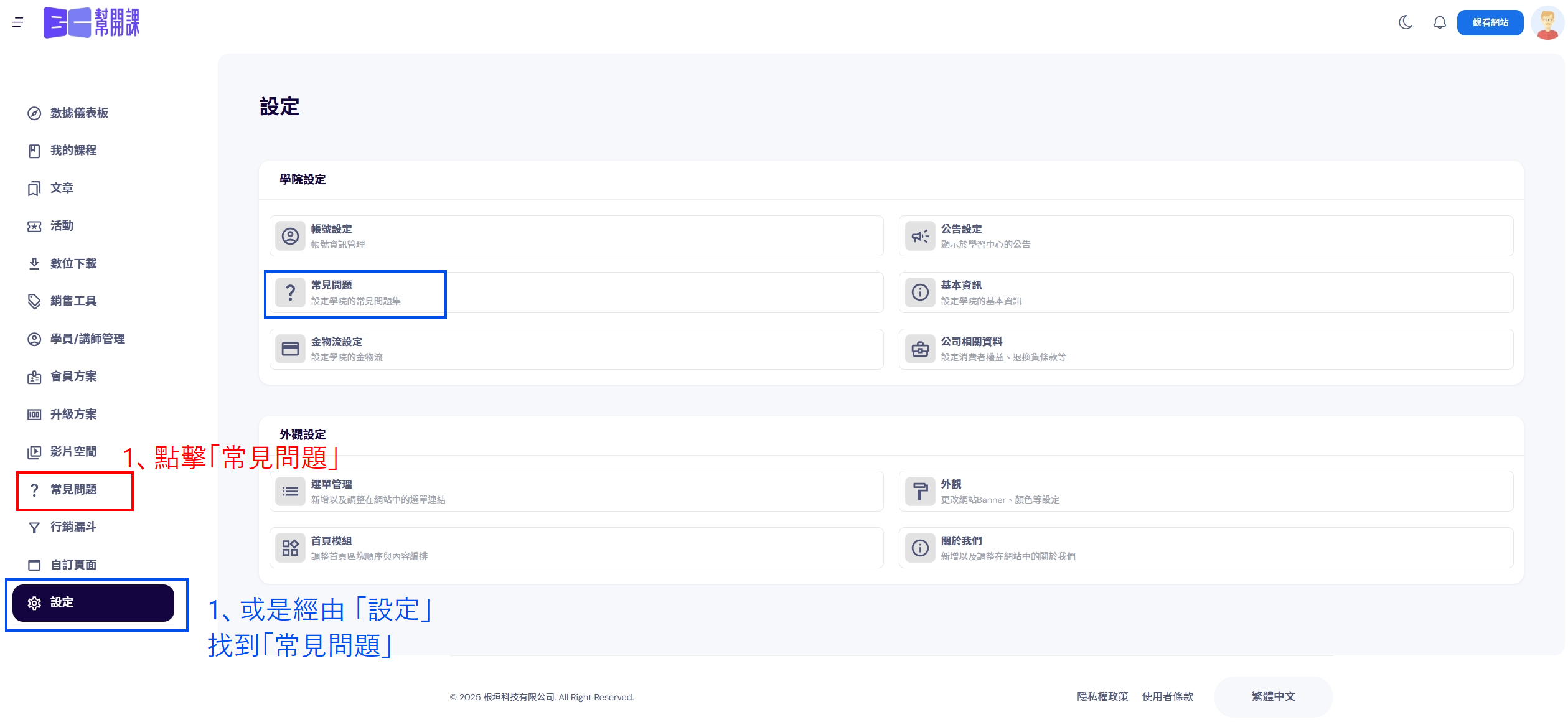 1、點擊左側功能列表「常見設定」 或是 點擊左側功能列表「設定」,再點擊「常見問題」。