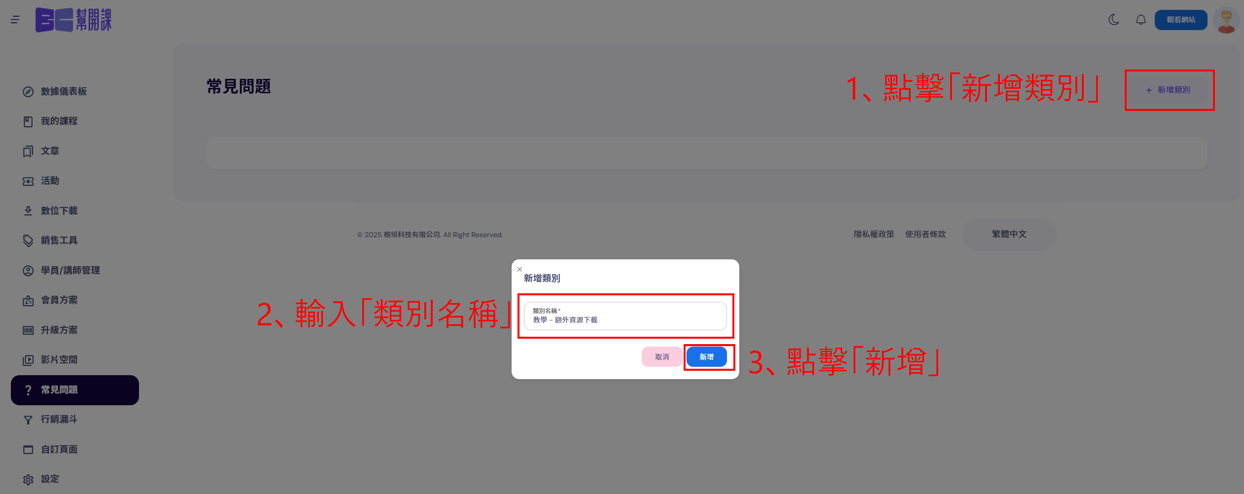 2、點擊右上角「新增類別」,輸入「類別名稱」,最後點擊「新增」。