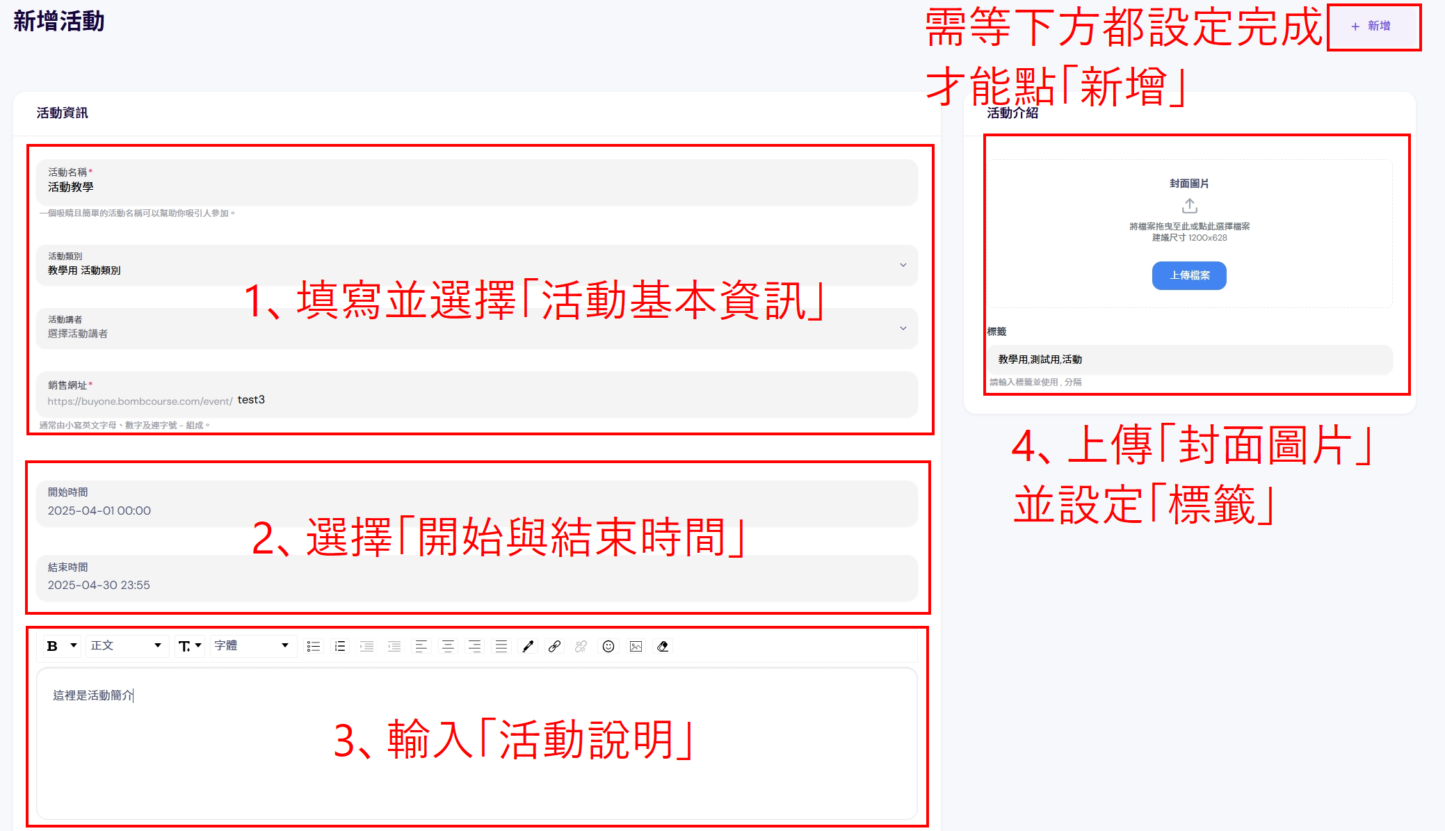 2、點擊「新增活動」後,進入編輯頁面,撰寫貼文「活動名稱」,選擇「活動類別」、「活動講者」,並填寫「銷售網址」,最後選擇活動「開始與結束時間」,下方可以撰寫「活動說明」。 右側可以新增活動「封面圖片」,並設置「標籤」。