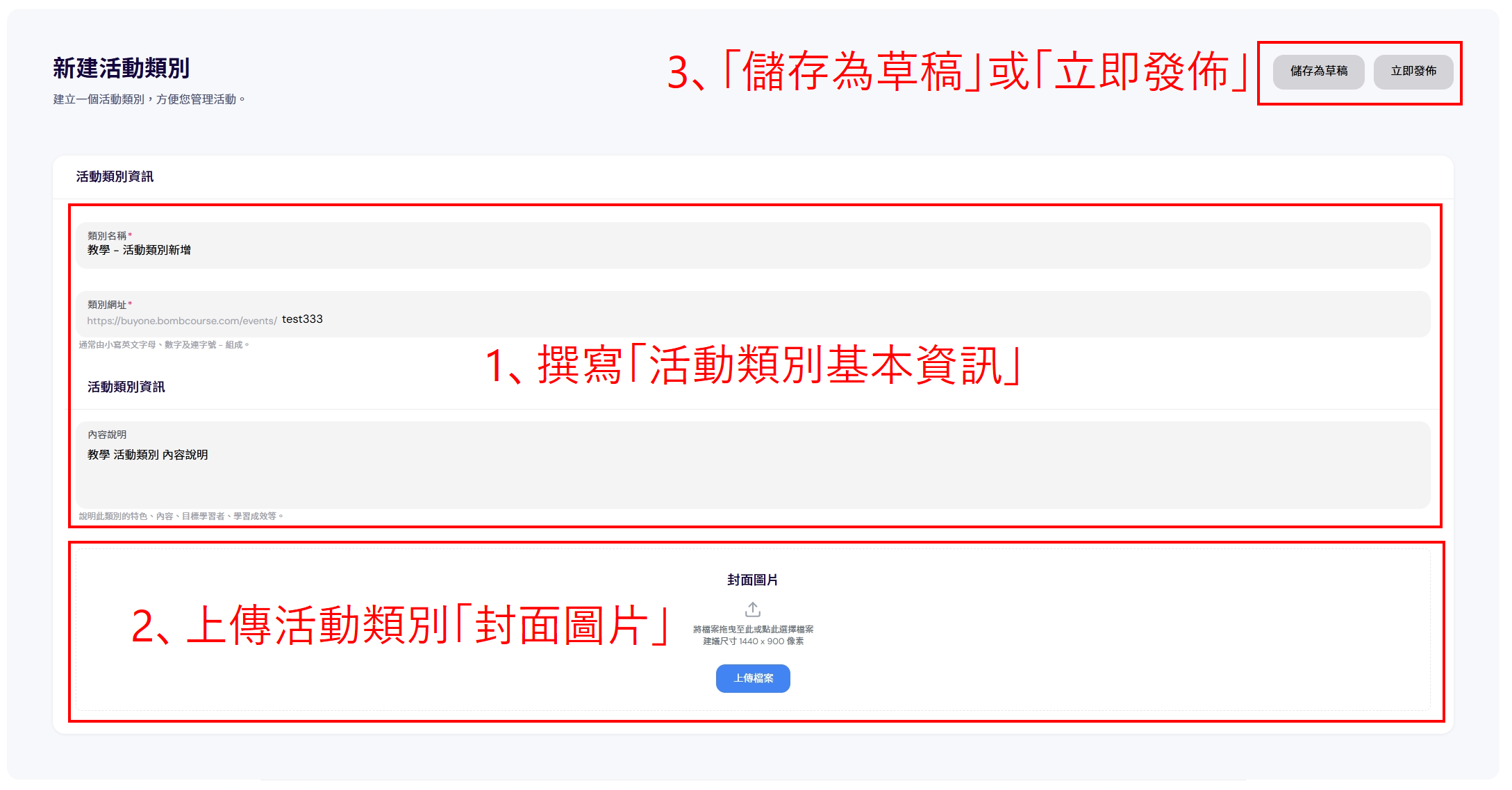 5、點擊「新增類別」後,輸入「類別名稱」、「類別網址」、「內容說明」,並上傳「封面圖片」。 右上角一樣可以進行「儲存為草稿」,或是「立即發佈」。