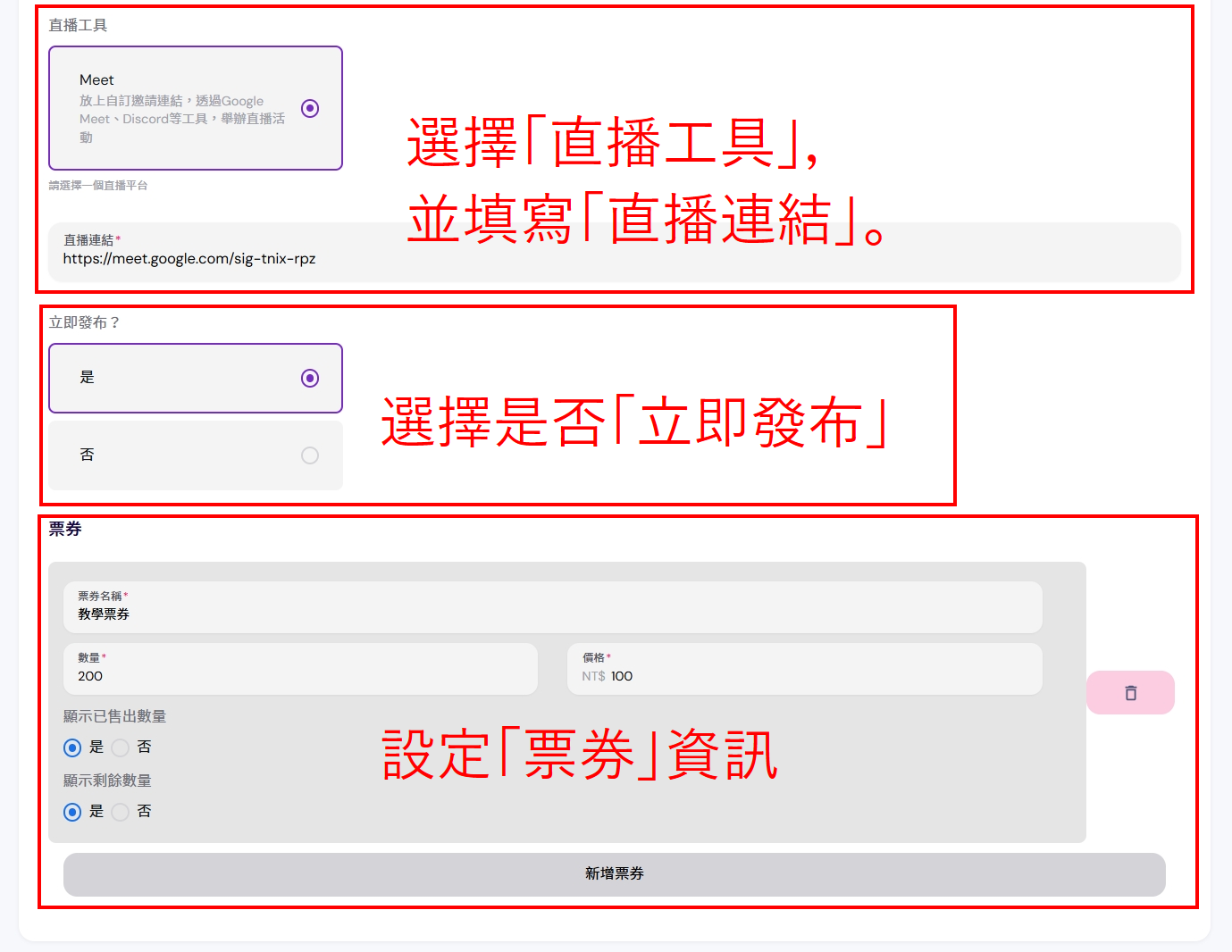 3、往下滑,還要選擇「直播工具」,並附上「直播連結」,再選擇是否「立即發布」,下方可以新增「票券」可以進行收費以及限制票券數量。 全部都設定完畢後,滑到最上方按「新增」