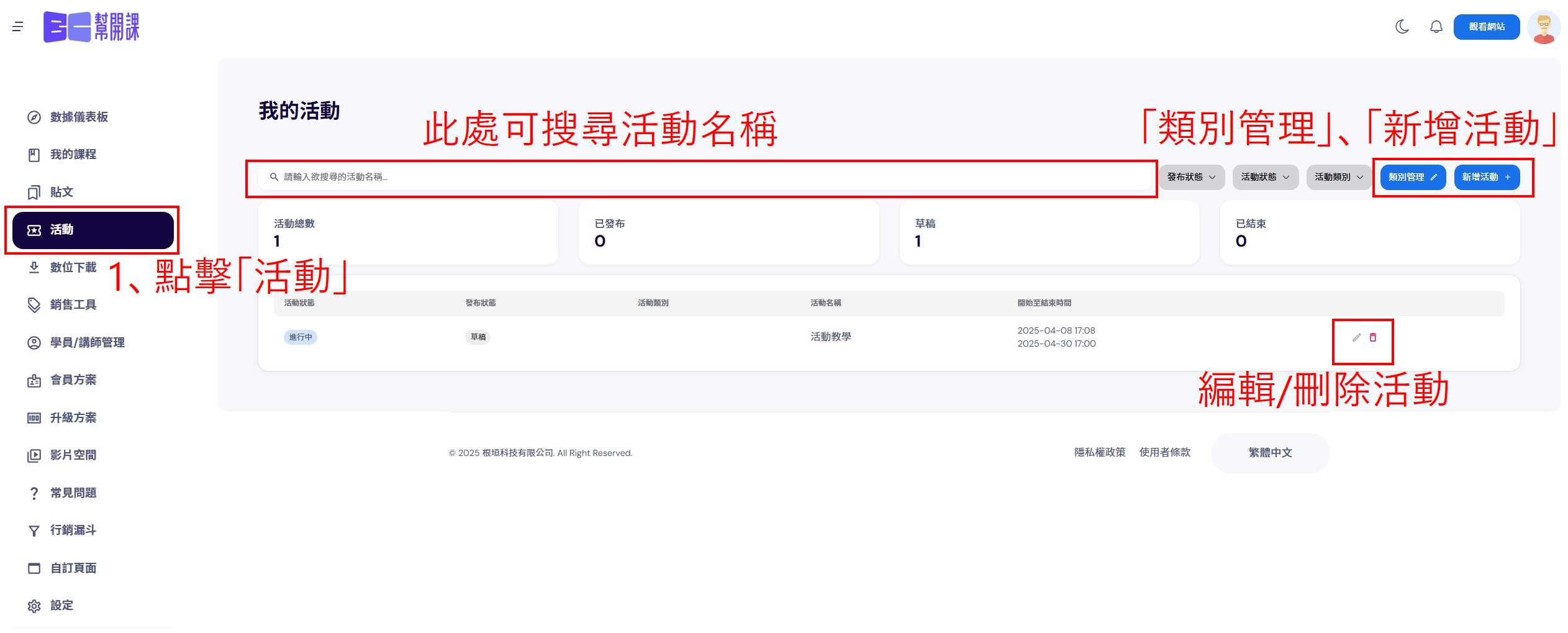 1、點擊左側功能列表「活動」,可以在此頁面 新增/編輯活動,和管理活動類別。 上方欄位可以搜尋活動。 右上角可以進行「類別管理」、「新增活動」。 活動後方可以進行「編輯」、「刪除」。