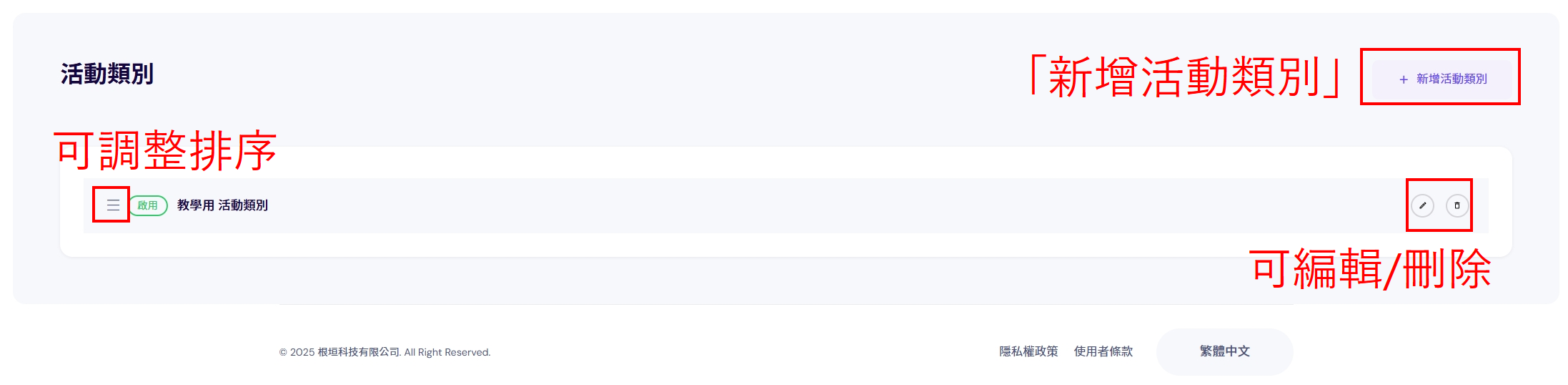 4、於活動頁面,點選「管理類別」,就會跳轉到「活動類別」頁面,此處可進行類別的操作,右上角可以「新增活動類別」,類別前方可「調整排序」,類別後方可以「編輯/刪除」。